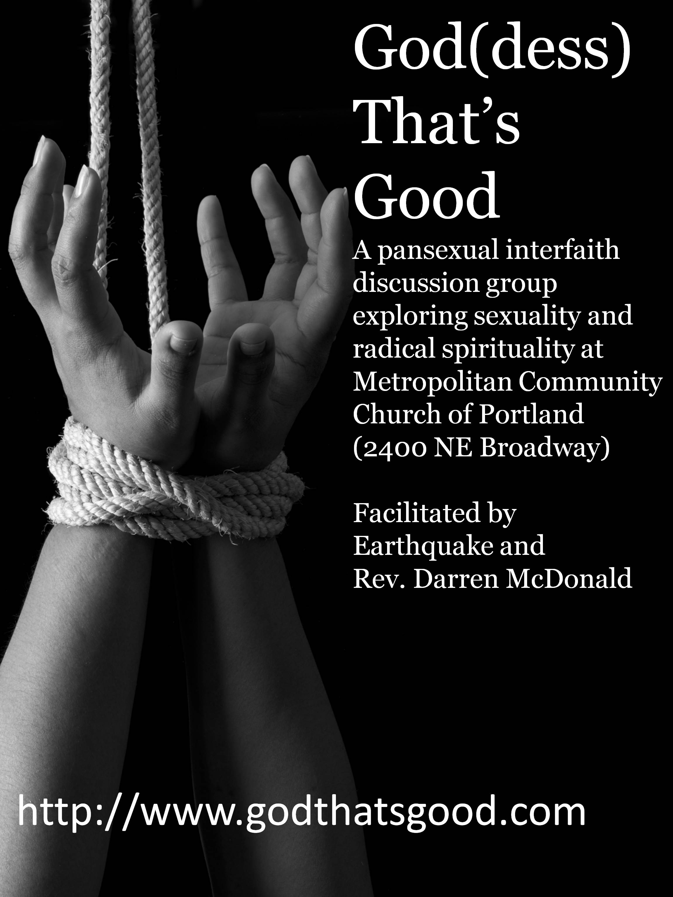What is it? A pansexual interfaith discussion group exploring sexuality and radical spirituality, hosted at Metropolitan Community Church of Portland (2400 NE Broadway).